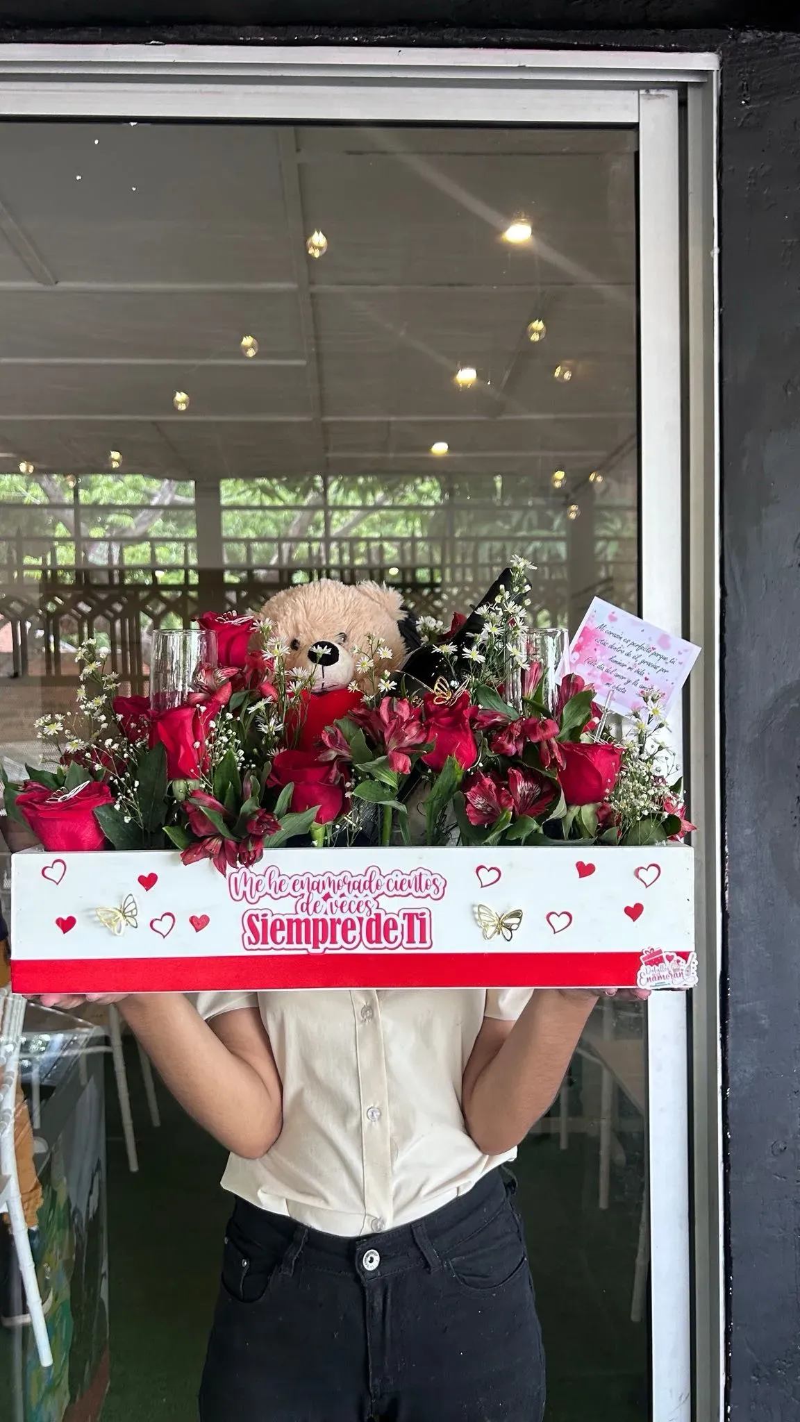 Sorprende a tu ser querido con esta encantadora Caja de Regalo Amoroso que incluye un hermoso ramo de flores, un tierno peluche y una dosis extra de amor. El regalo perfecto para expresar tus sentimientos y hacer que su día sea inolvidable. ¡Hazle saber cuánto le importas!